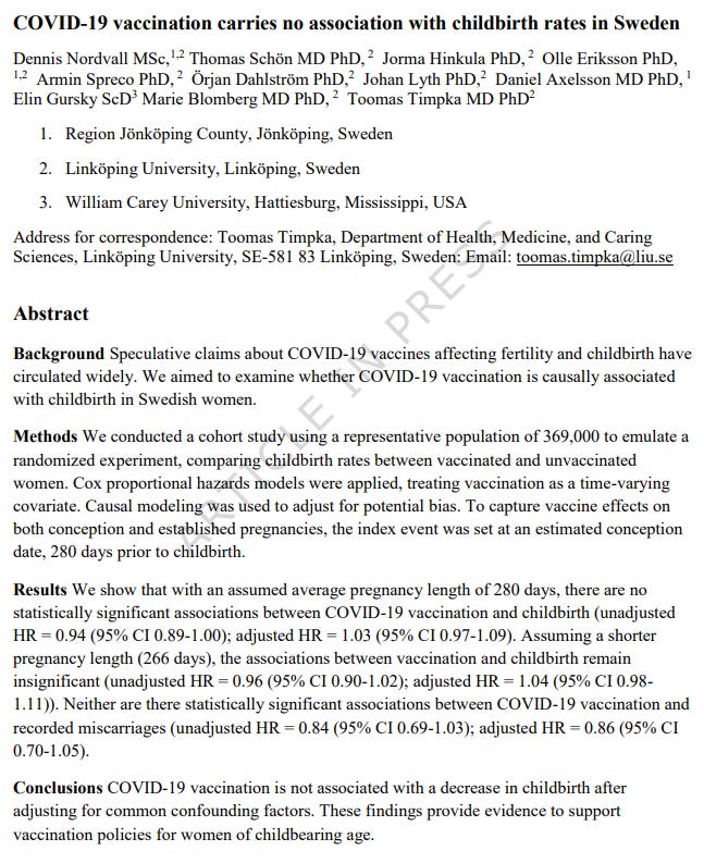 Nature “pre-published”1 on January 21, 2026, a new study: “COVID-19 vaccination carries no association with childbirth rates in Sweden,” by Dennis Nordvall et al.2