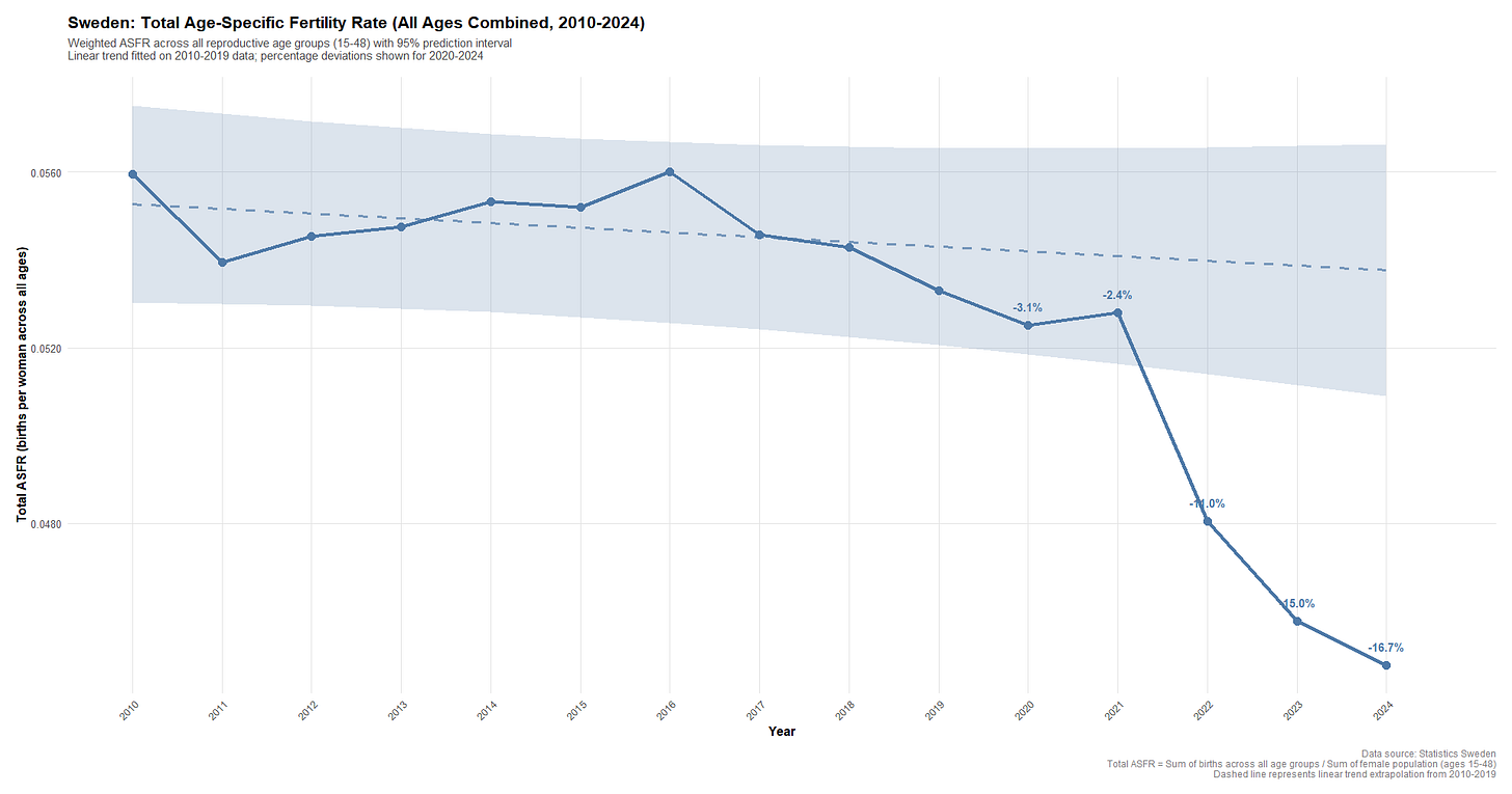 As one of the earliest observers to document Sweden’s drop in birth rates starting in 2022, coinciding with the COVID-19 vaccine roll-out, and having continued to study fertility trends since, the topic immediately caught my attention.