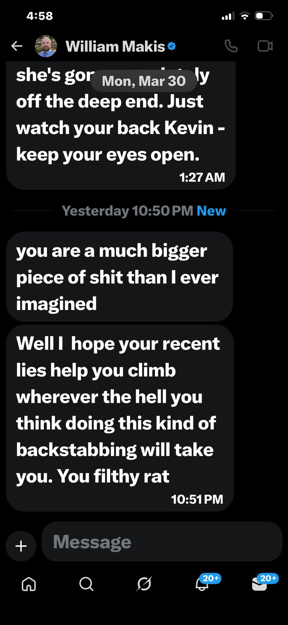 Then the private channels went public. At 11:08, McKernan published his DM exchanges with Makis, exposing the tone of the behind-the-scenes pressure campaign.65