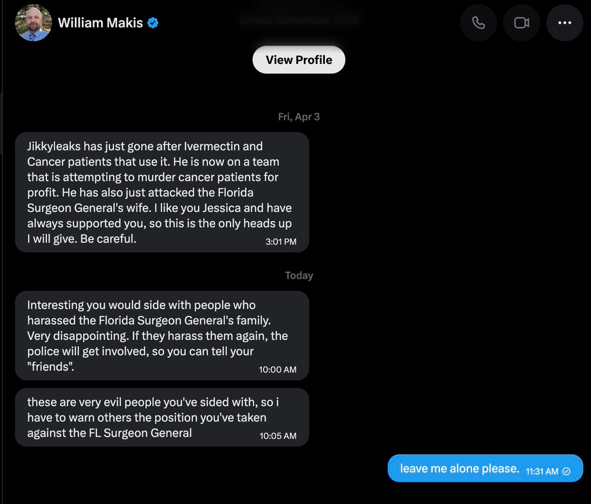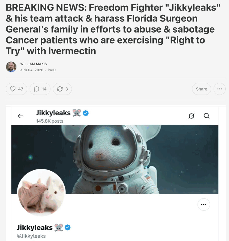 Jikkyleaks stated he was “disgusted” by Makis’s conduct since the article - in particular the decision to blame everyone around the author, including people uninvolved, and to send what he called “defamatory and predatory DMs” to mutual contacts. He supported right-to-try access to repurposed drugs for cancer, he said, but not behind paywalls and secret protocols.43 Hank Rearden, an MD-PhD who had spent the previous days defending Makis, reported that Makis had blocked him too - despite years of support and having personally referred stage-4 cancer patients to his protocols.44