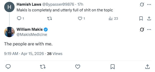 On April 1, we began reaching out directly to Makis’s significant past supporters, while we unearthed the 2025 “conflict” between Makis and A Midwestern Doctor - a major figure in the medical freedom space with a Substack readership dwarfing his own - demonstrating that the pattern of burning former allies and branding them pharmaceutical assets was nothing new in the COVID space for Makis.7