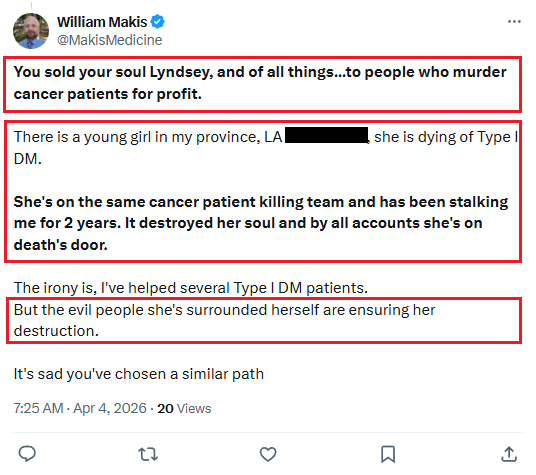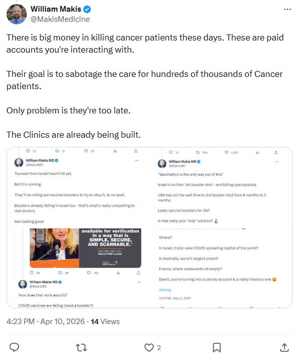 What the record makes clear is that Makis does not belong to “any side” of the vaccines argument, or of the cancers treatments arguments. He is not pro-vaccine or anti-vaccine. He is not a cancer expert, a medical freedom advocate, or anyone’s ally. He is a man who manipulates whatever system he inhabits - an oncology department for the short time he had one, a online movement when he found one - and who turns on anyone who exposes him, rejects him, or simply stops being useful. The targets change; the mechanism does not. He rode the institutional system in Alberta until it ejected him; he is now riding the online ecosystem, where the boundaries are far wider and the consequences far slower to arrive.