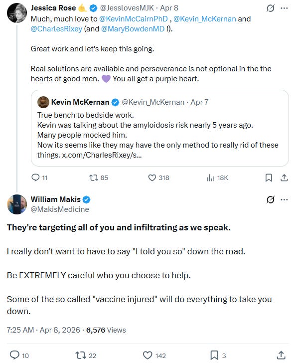 By the final days of the period, the pattern had become self-sustaining. Dr. Jack Kruse publicly expressed full confidence in McKernan,85 reinforcing his standing in the space. An X user, Kristina, published a detailed critique of Makis’s conduct and claims.86 McKernan continued dismantling Makis’s positions in an exchange with Dr. Henry Ealy.87 Amy Kelly, a prominent figure in the vaccine safety documentation effort, publicly called attention to the damning evidence against Makis.88