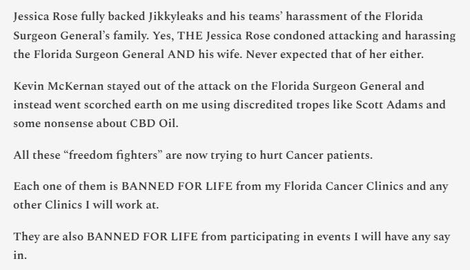 That same day, Makis published a Substack article also branding McKernan and Rose as pharmaceutical industry agents, accusing Rose of “condoning the harassment of the Florida Surgeon General and his wife,” and declaring all of his critics “BANNED FOR LIFE” from his Florida cancer clinics - and any event he would be involved in.55