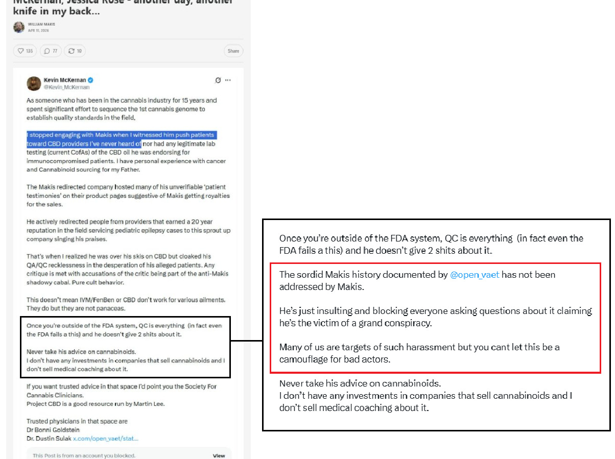 What followed was a cascade of firsthand testimony. McKernan, drawing on fifteen years of quality control in the cannabis industry and his sequencing of the first cannabis genome, recounted watching Makis redirect immunocompromised cancer patients toward a CBD provider with no legitimate lab testing - a company that hosted Makis’s unverifiable “patient testimonies” on its product pages, suggestive of a financial arrangement. Makis vehemently denied this conduct after which McKernan provided video evidence to the contrary.41 Any critique, McKernan said, was met with accusations of belonging to a shadowy anti-Makis cabal. He described the dynamic bluntly as “pure cult behavior,” noting that Makis’s documented record had never been addressed - only met with insults, blocks, and claims of victimhood.42