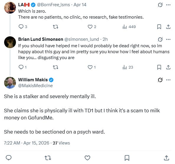 By morning, the attacks had returned to familiar targets. At 09:22, he was targeting LA again - the Albertan woman who had helped source material for our original article - calling her “a stalker and severely mentally ill,” accusing her of faking a Type 1 diabetes diagnosis “to milk money on GoFundMe,” and declaring that “she needs to be sectioned and put in a psych ward.” The claim that a woman injured by COVID was fabricating her condition for donations simply because she had dared to call him out, coming from a man who had built his public persona on manufactured stories, required no commentary.98