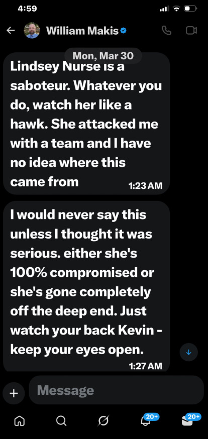 The article went live at 02:02 on March 30. By 13:43, Kelly DNP, a prominent voice with over 166,000 followers, had publicly shared the announcement tweet, tagging Makis and inviting him to comment on the veracity of the elements advanced.2 Rather than address any of the documented facts, Makis immediately took to private channels. Within two hours, he was messaging Kevin McKernan on X, calling Lyndsey House "a saboteur" and warning him to "watch your back - keep your eyes open."3